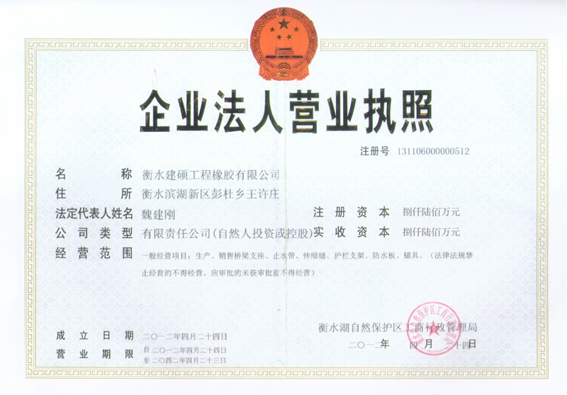衡水建碩工程橡膠有限公司座落于衡水市濱湖新區,占地面積50000平方米,注冊資金壹億零捌拾萬元整,是生產橡膠支座、盆式支座、充氣芯模、伸縮裝置、止水帶的專業廠家。公司始建于九十年代,經過近二十年的發展壯大,現有員工300多人,其中高級技術人員45人,高級技工103人。